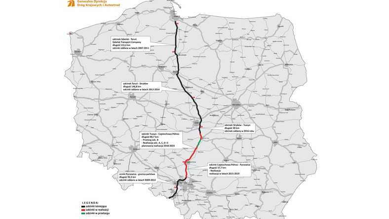 The autostrada a1, officially named amber highway (pol autostrada a1. Przebieg drogi, odcinki gotowe, w budowie, planowane.